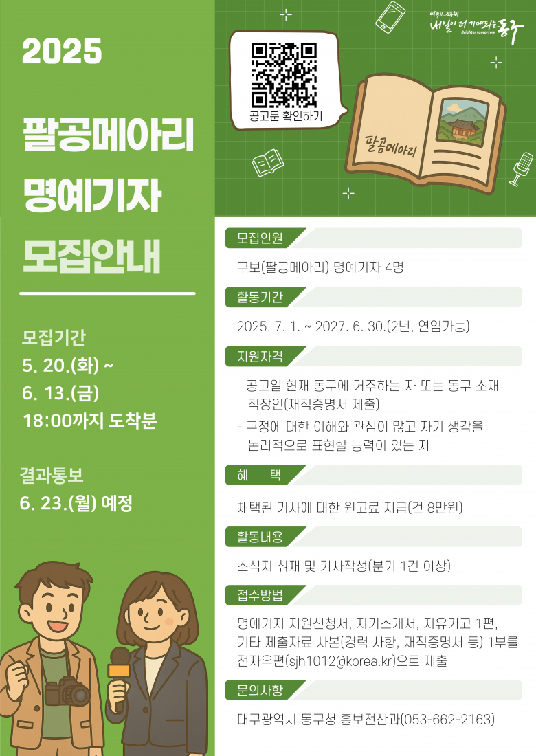 대구 동구청은 6월 13일까지 동구 소식지 ‘팔공메아리’ 명예기자와 제13기 동구 블로그 기자단 그리고 제3기 유튜브 기자단을 모집한다고 20일 밝혔다.