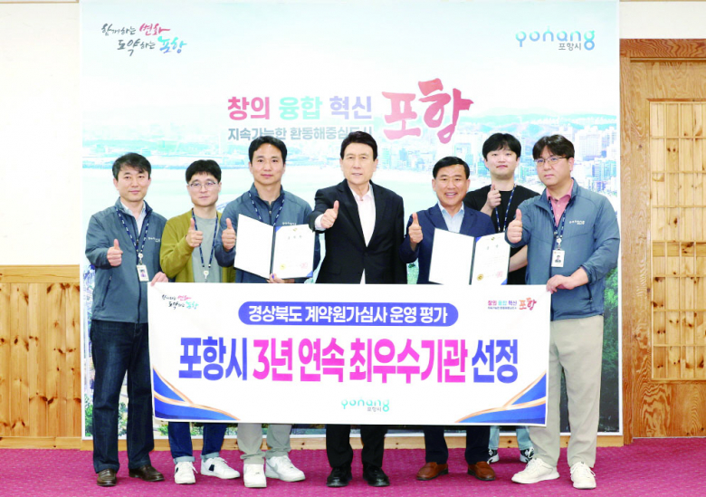 포항시가 경북도가 주관한 ‘2024년 계약원가심사 운영평가’에서 최우수상을 수상하며, 2022년부터 2024년까지 3년 연속 최우수기관(1위)에 선정되는 영예를 안았다고 20일 밝혔다. 이번 수상으로 포항시는 경북도 최고의 계약원가심사 기관임을 다시 한번 입증했다.