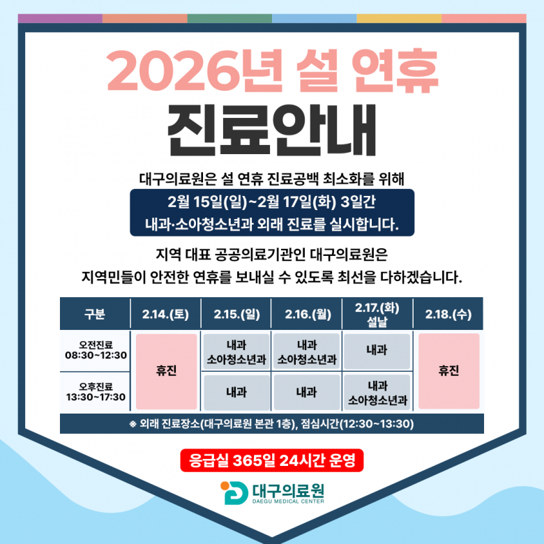 대구의료원(의료원장 김시오)이 설 연휴 기간(2.14.~18.) 응급실 운영을 강화하고, 15일(일)~17일(화)은 내과·소아청소년과 외래 진료를 실시한다.