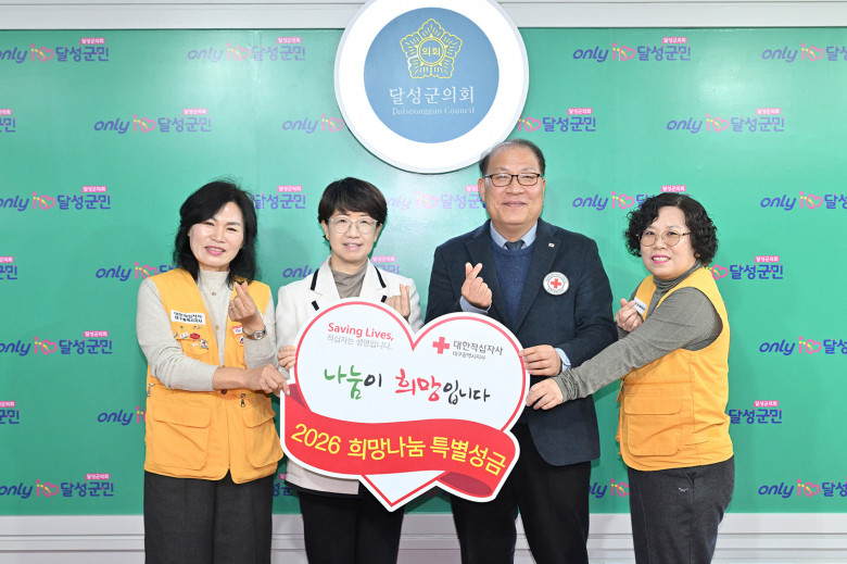 달성군의회는 지난 10일 의장실에서 대한적십자사 대구지사에 2026년 특별성금을 전달하며 이웃사랑 실천에 동참했다. 이날 전달식에는 김은영 달성군의회 의장 비롯해 고홍원 사무처장, 김경 달성군협의회 회장 등 관계자들이 참석했다.