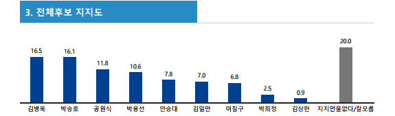 이어 공원식 11.8%, 3명의 후보가 오차범위(±3.5%p) 안에서 선두 경쟁을 벌였다. 다음으로 박용선 후보가 10.6%, 안승대 후보 7.8%, 김일만 후보 7.0%, 이칠구 후보 6.8%, 박희정 후보 2.5%, 김상헌 후보 0.9%순으로 나타났다. 다만 아직 후보를 정하지 못한 ‘의견유보’(지지인물 없다+잘모름)가 20.0%로 가장 높았다.