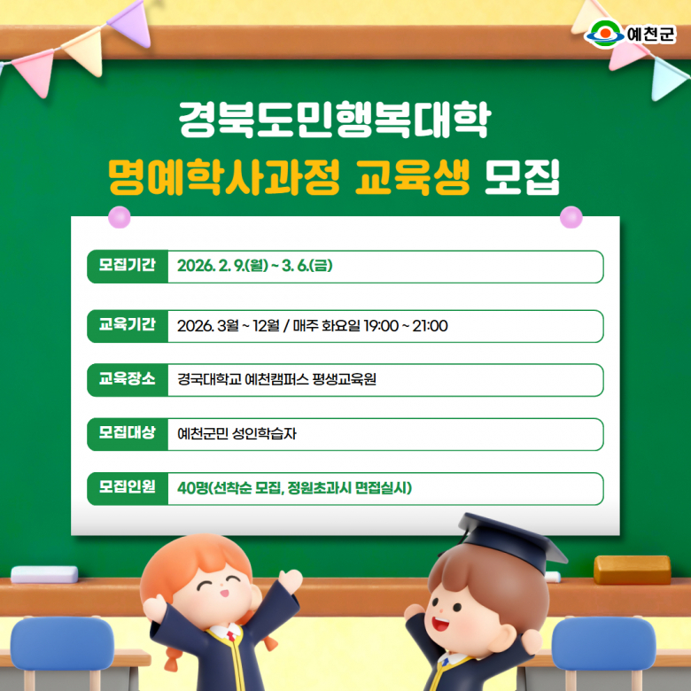 예천군은 군민 누구나 배움을 통해 성장하는 ‘평생학습도시 예천’ 구현을 위해 다음달 6일까지 ‘2026년 경북도민행복대학 예천캠퍼스 명예 학사 과정’ 새내기 교육생을 모집한다.