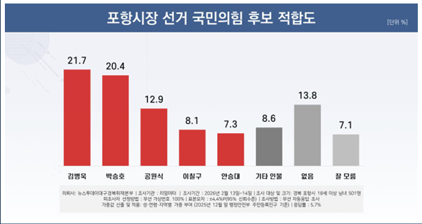 설 연휴 직전인 지난 13~14일 이틀간 여론조사 전문기관 리얼미터가 포항시 만 18세 이상 남녀 501명을 대상으로 실시한 국민의힘 후보 적합도(공천을 누가 받는 것이 좋다고 생각하십니까) 조사 결과, 김병욱 전 국회의원 21.7%, 박승호 전 포항시장 20.4%로, 두 후보가 1.3%p(포인트) 차의 초박빙 승부를 벌이고 있는 것으로 나타났다.
