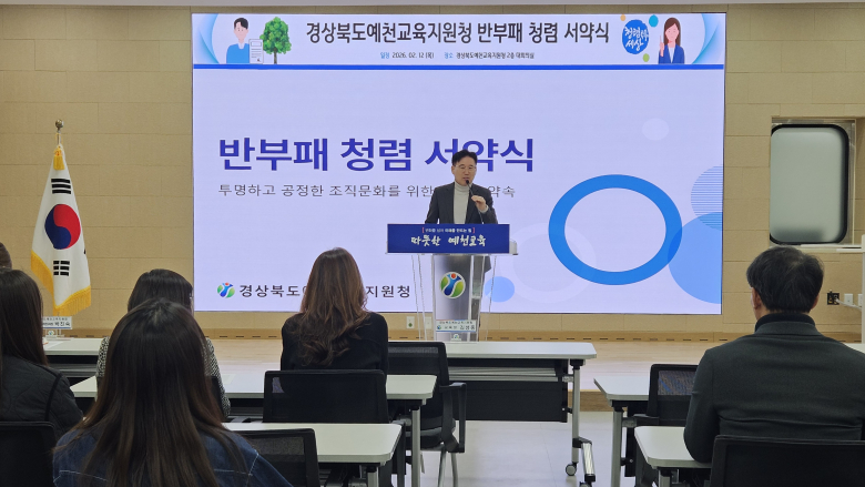 예천교육지원청은 지난 12일 지원청 전 직원 60명을 대상으로 청렴 의식 고취와 청렴 문화 확산을 위한 ‘반부패 청렴 서약식’을 실시했다.
