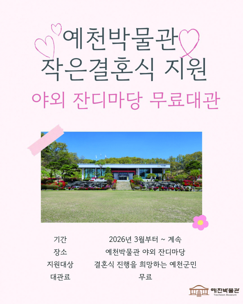 특히 자연 친화적이고 개방감 있는 예천박물관 야외 잔디마당의 공간적 특성을 살려 가족·친지 중심의 따뜻한 예식을 지원할 계획이다. 대관 대상은 신청일 현재 부부 중 1인 이상이 예천군에 주소를 두고 있는 예비 부부로, 신청을 희망하는 경우 예천박물관 홈페이지에서 신청서를 내려받아 작성 후 제출하면 된다.