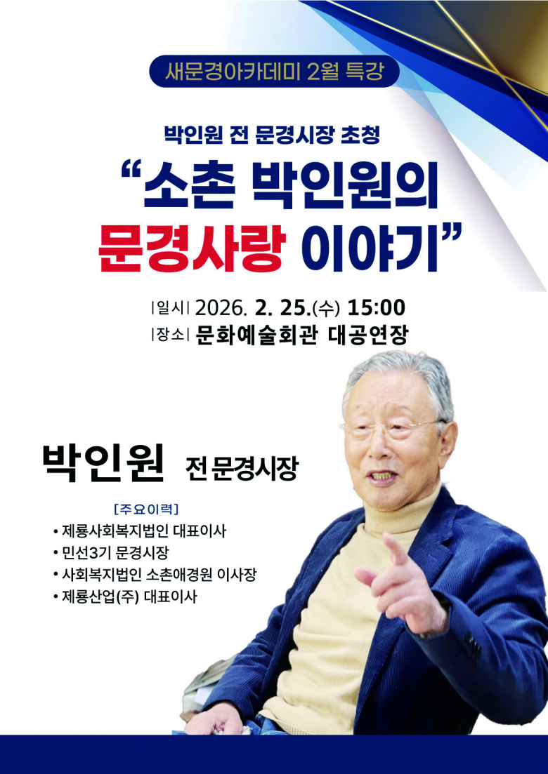 이번 특강은 박인원 전 문경시장을 초청하여 “소촌 박인원의 문경사랑 이야기”를 주제로 진행되며, 대담 형식으로 운영된다. 특히 이번 대담에서는 ▲박인원이 걸어온 길 ▲문경시가 나아갈 길 ▲박인원이 앞으로 나아갈 길을 중심으로, 지역 발전과 미래 비전에 대한 진솔한 이야기를 나눌 예정이다.
