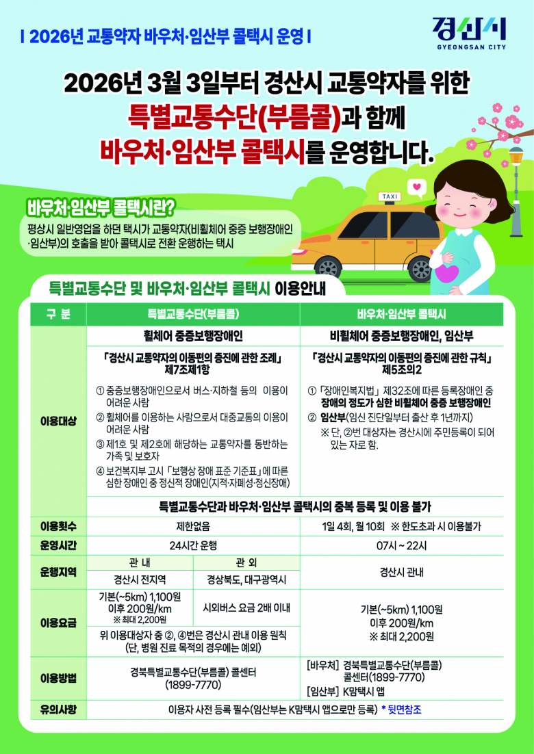 경산시는 교통약자와 임산부의 이동 편의 증진을 위해 ‘교통약자 바우처·임산부 콜택시 사업’을 내달부터 본격 시행한다고 밝혔다.