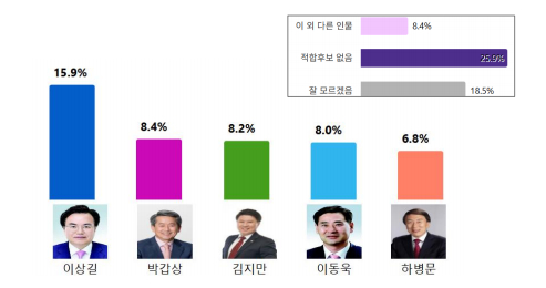 여야 차기 북구청장 후보 적합도 조사에서도 이상길 후보가 선두를 차지했다. ‘차기 북구청장 후보로 누가 적합하다고 생각하느냐’는 질문에 이상길 후보는 12.3%로 1위를 기록했다.