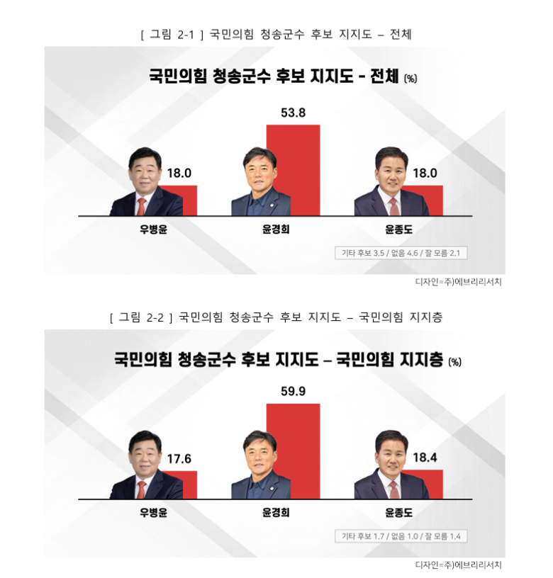 지난달 27일 사단법인 경북지역신문총연합회 의뢰로 에브리리서치가 실시한 여론조사 결과, 국민의힘 공천 경쟁에서 윤경희 현 군수가 압도적 1위를 기록하며 ‘수성’에 유리한 고지를 점한 것으로 나타났다.