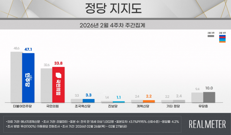 이재명 대통령의 국정수행 긍정평가가 1월 3주차(53.1%) 이후 6주 만에 떨어졌고, 여당인 더불어민주당도 동반 하락했다.