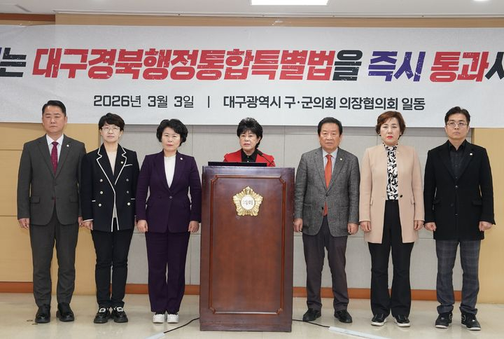 대구시 구·군의회의장협의회(이하 협의회)가 3일 수성구의회에서 기자회견을 열고 대구경북행정통합특별법의 국회 본회의 통과를 강력히 요구하는 선언문을 발표했다.