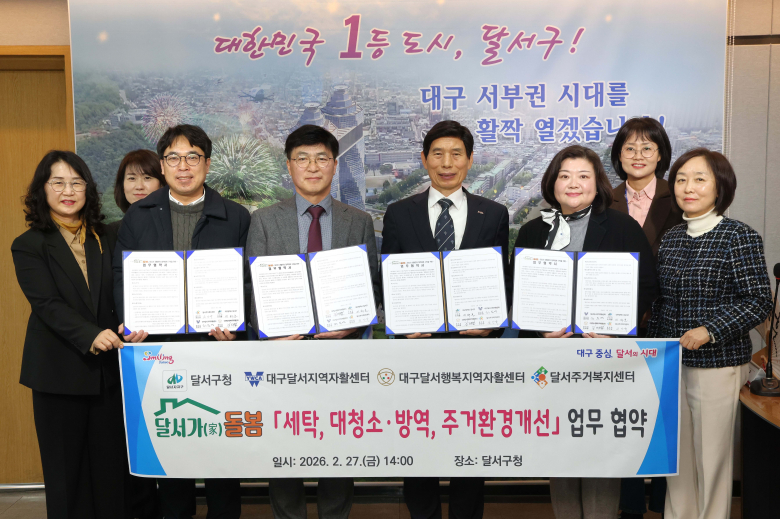 이번 협약은 세탁, 대청소·방역, 주거환경 개선 등 생활밀착형 서비스를 제공하기 위한 것으로, 전문 역량을 갖춘 지역 기관과의 민·관 협력을 통해 보다 촘촘한 지역사회 돌봄망을 구축하고 달서구만의 통합돌봄 모델인‘달서가(家)돌봄’사업을 안정적으로 정착시키기 위해 마련됐다.