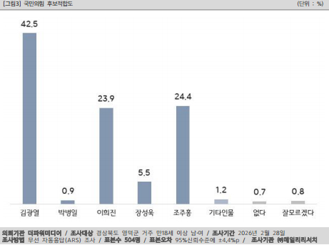 국민의힘 지지층에서는 김광열 44.4%, 조주홍 25.2%, 이희진 23.9%로, 김 군수가 선두를 기록했다.
