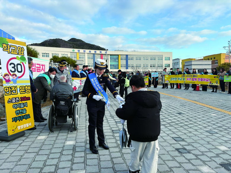 영양경찰서는 4일 영양초등학교에서 안전 최우선 가치 확대라는 목표를 설정하고 경찰, 군청, 교육지원청, 녹색어머니회, 모범운전자 등 총 60여명이 참여한 가운데 어린이 교통 안전 캠페인을 펼쳤다고 밝혔다.