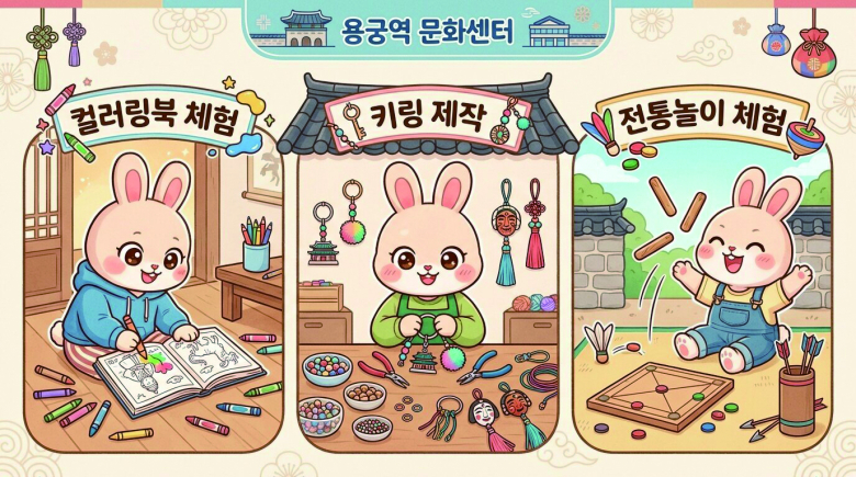 용궁역사 내에서는 오전 10시부터 오후 5시까지 창의력을 발휘할 수 있는 컬러링북 및 키링 만들기 체험이 상시 운영되며, 야외 테마공원에서는 전 세대가 함께 즐길 수 있는 전통 놀이 체험 공간이 마련돼 활기찬 분위기를 더할 예정이다.금인욱기자