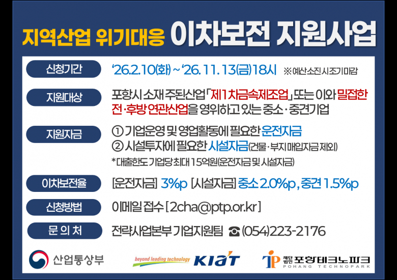 (재)포항테크노파크는 산업위기 상황에 대응해 지역 철강 관련 기업의 금융 부담을 완화하기 위한 ‘2026년 지역산업 위기대응 이차보전 지원사업’의 신청 접수를 진행하고 있다고 밝혔다.