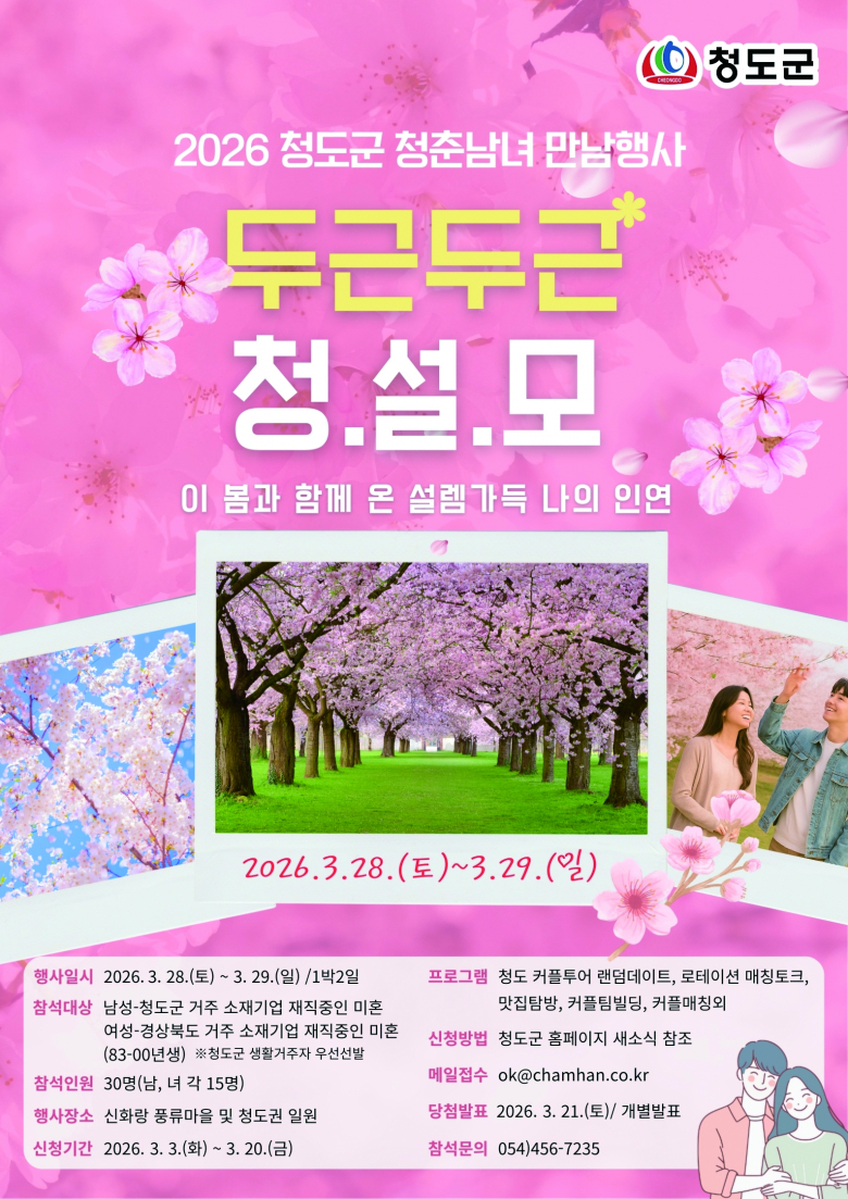 청도군은 아름다운 청도 관광 명소를 여행하며 자연스럽게 인연을 찾는 미혼남녀 만남행사 ‘청(도)설(렘)모(임) 프로젝트’를 개최하고 참가자를 모집한다고 밝혔다.