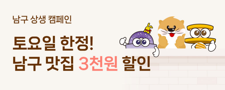 ‘토요일 N 남구데이’는 매주 토요일 대구로 앱을 통해 1만원 이상 주문 시, 3,000원 할인쿠폰을 제공하는 프로그램이다. 발급된 쿠폰은 남구에 위치한 ‘대구로’ 입점 업소에서만 사용 가능하며, 매주 토요일 오전 10시부터 쿠폰이 발급된다.