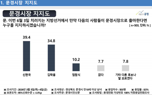 9일 여론조사 공정이 문경시민신문 의뢰로 지난 3월 5~6일 문경시에 거주하는 만 18세 이상 남녀 503명을 대상으로 실시한 여론조사(무선 ARS·구조화된 설문지)에 따르면 ‘문경시장 후보 지지도’ 조사에서 신현국 후보가 39.4%로 1위를 기록했다.