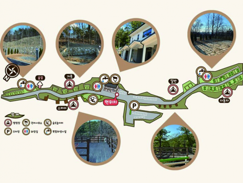 야영장은 총 23면 규모로 자동차야영장 7면, 일반야영장 4면, 가족야영장 8면, 스카이야영장 4면으로 구성돼 다양한 형태의 캠핑을 즐길 수 있도록 마련됐다. 편의시설로는 관리사무소 1동과 복합위생시설 3동이 설치돼 이용객들의 편의를 높였다.