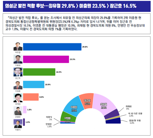 10일 내외경제TV와 포털신문이 여론기관 ㈜비전코리아 솔루션즈에 의뢰해 지난 6일 하루 동안 의성군에 거주하는 만 18세 이상 남녀 502명을 대상으로 실시한 조사 결과, ‘의성군 발전에 가장 적합한 후보’를 묻는 질문에 응답자의 29.8%가 최유철 전 의장을 꼽았다.
