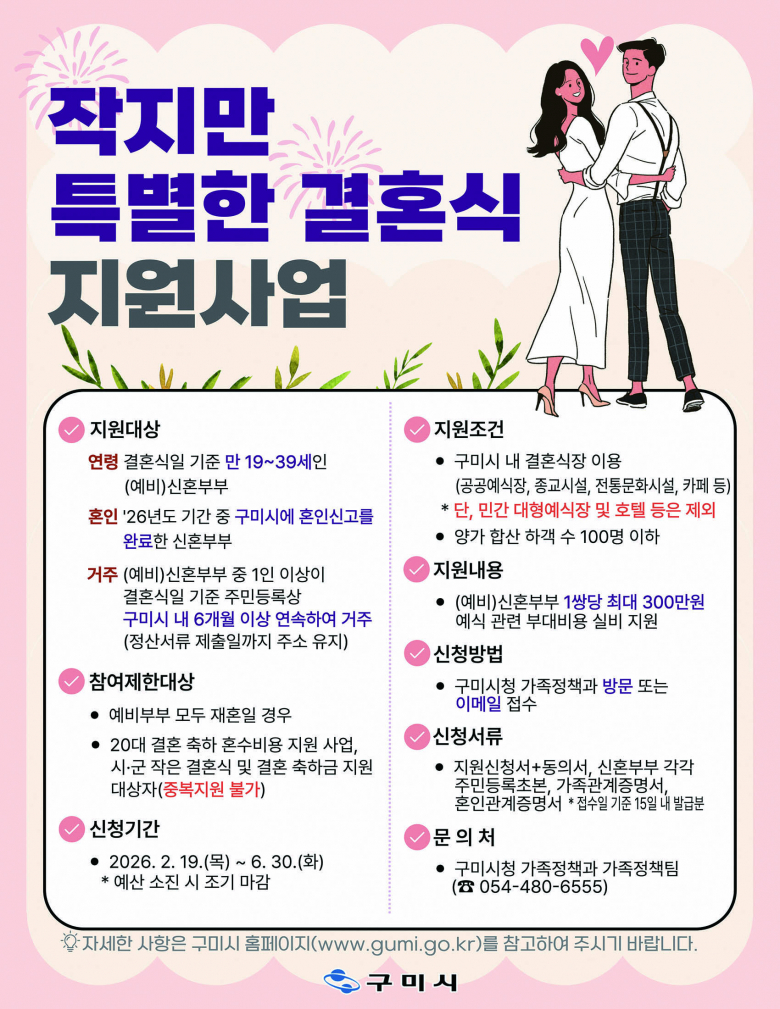 예식 이후 초기 정착을 위한 지원도 병행한다. ‘청년근로자 결혼장려금 지원’ 사업을 통해 25년 이후 혼인신고를 한 구미 거주·근로 청년 400가구에 카드형 구미사랑상품권 100만 원을 지급한다.