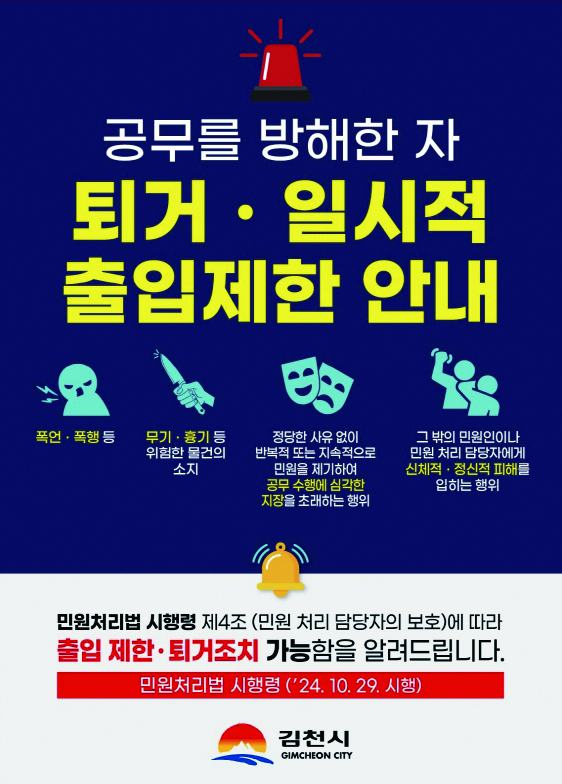 김천시가 공무수행을 방해하는 악성 민원인에 대한 출입제한 및 퇴거조치를 본격 시행하는 등 민원 환경 개선에 나섰다.