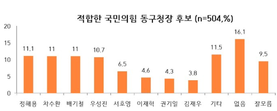 이어 정해용 10.6%, 권기일 9.5%, 배기철 8.1%, 차수환 8.0%, 우성진 7.9% 순으로 나타났다.