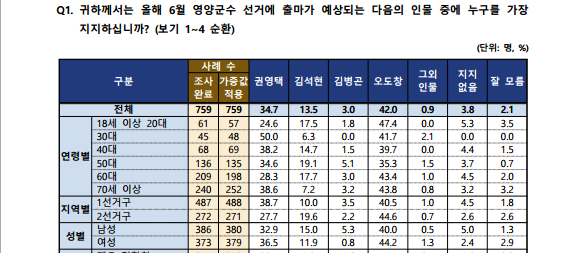 권영택 전 영양군수는 34.7%로 뒤를 이으며 두 후보 간 격차는 7.3%포인트로 나타났다.