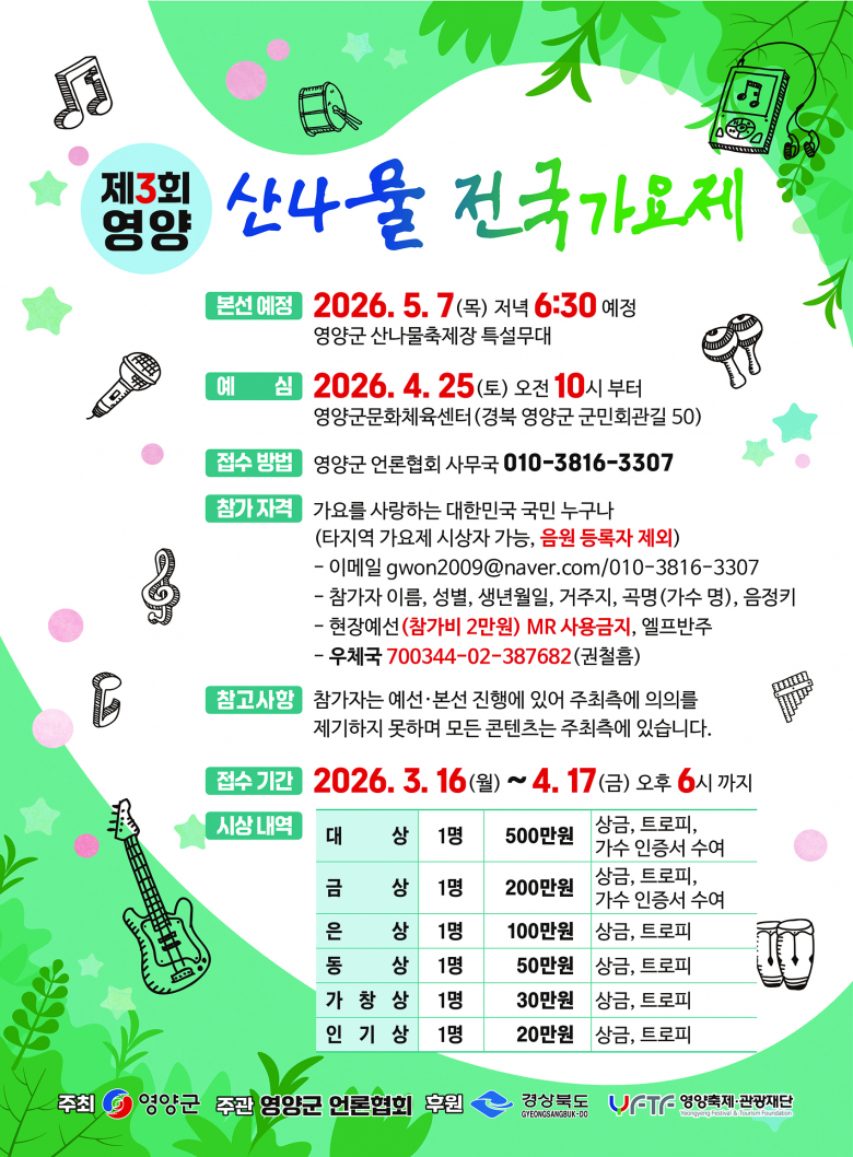 오는 5월 ‘제21회 영양산나물축제’의 시작을 알리는 ‘제3회 영양 산나물전국가요제’를 개최하고, 무대를 빛낼 주인공들을 모집한다.