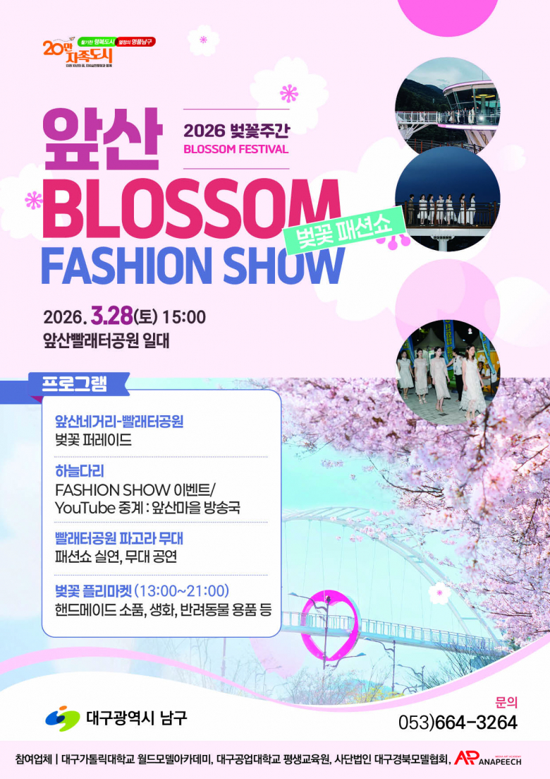 이번 행사는 벚꽃 개화시기에 맞춰 오는 28일 앞산빨래터공원 특설 무대와 앞산해넘이전망대, 하늘다리에서 전문 모델과 시민들이 참여하는 패션쇼 이벤트와 다양한 플리마켓이 운영된다.