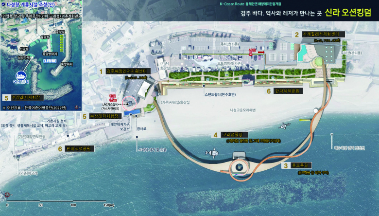 해양레저관광거점 조성사업은 문무대왕 역사 콘텐츠와 동해안의 풍부한 해양자원을 결합해 경주만의 차별화된 해양관광 콘텐츠를 구축하는 사업이다. 총 사업비 490억 원(국비 245억 원, 도비 73억5천만 원, 시비 171억5천만 원)이 투입되며, 감포읍 나정해수욕장 일원에 대규모 해양레저단지가 조성될 예정이다.