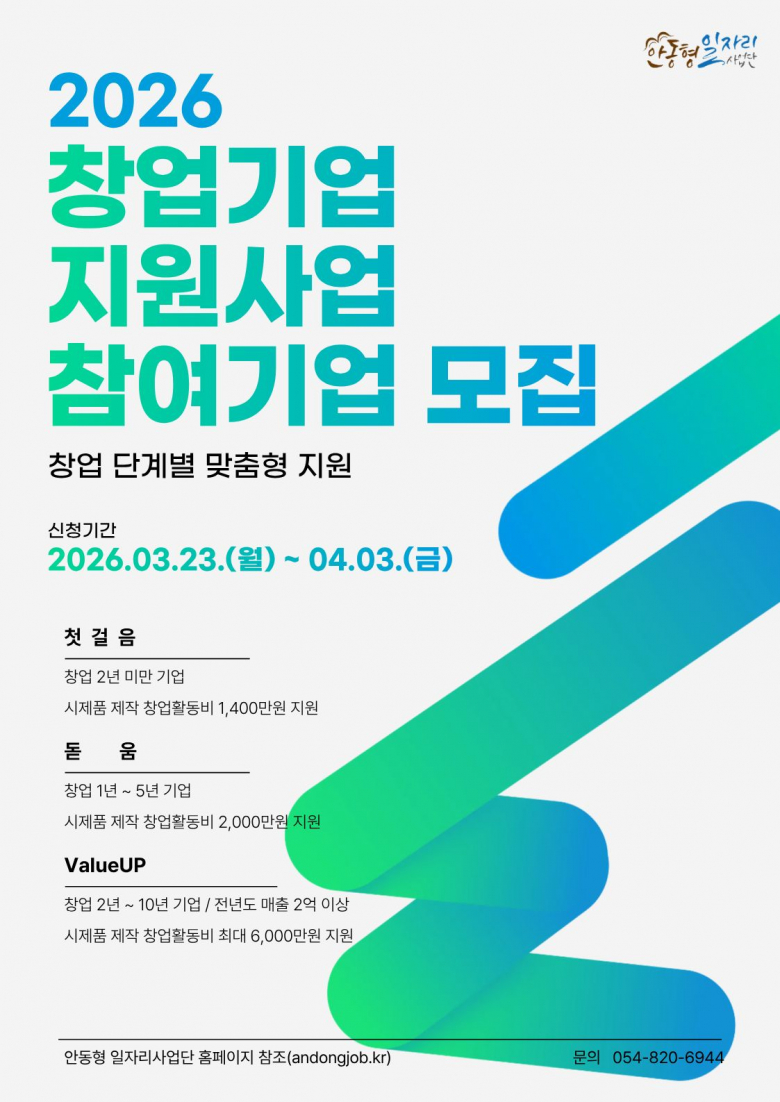 안동시는 국립경국대학교 안동형일자리사업단과 함께 ‘2026년 창업기업 지원사업’ 참여기업을 모집한다.