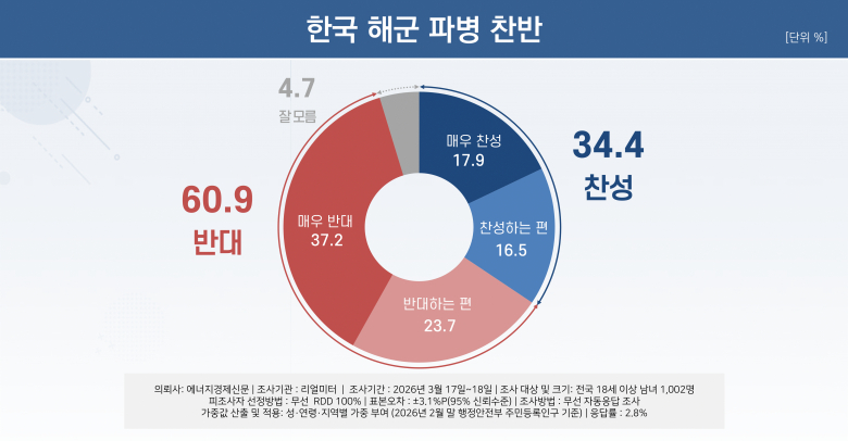 반면, 해군 파병에 ‘찬성한다’는 응답은 34.4%(매우 찬성 17.9%, 대체로 찬성 16.5%)로, 반대 여론이 26.5%p 더 높았다.