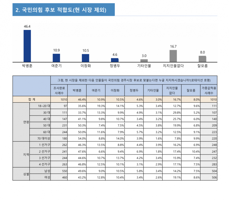 다만 지지 인물 없음(16.7%)과 잘 모름(8.0%)을 합친 무응답층이 24.7%에 달해, 향후 공천 과정에서 이들의 표심 향방이 막판 변수가 될 전망이다.
