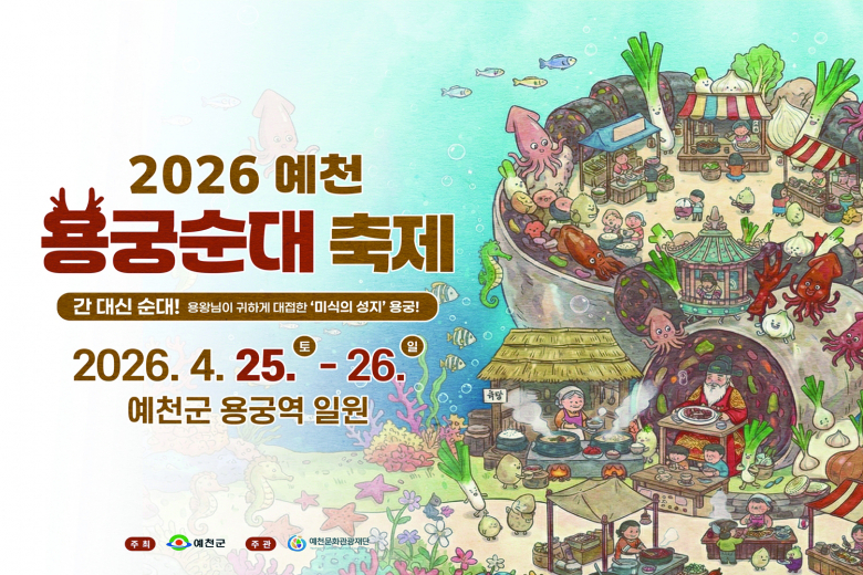 ‘2026 예천 용궁순대축제’는 다음달 25일부터 26일까지 이틀간 예천군 용궁역 일원에서 개최되며, ‘간 대신 순대! 용왕님이 귀하게 대접한 미식의 성지 용궁’을 주제로 다양한 먹거리와 체험 프로그램을 선보일 예정이다.