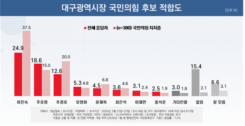 이어 추경호 전 경제부총리(12.6%)가 뒤를 이었고, 유영하(5.3%), 윤재옥(4.5%), 최은석(3.6%), 이재만(3.1%), 홍석준(2.5%) 순으로 나타났다.