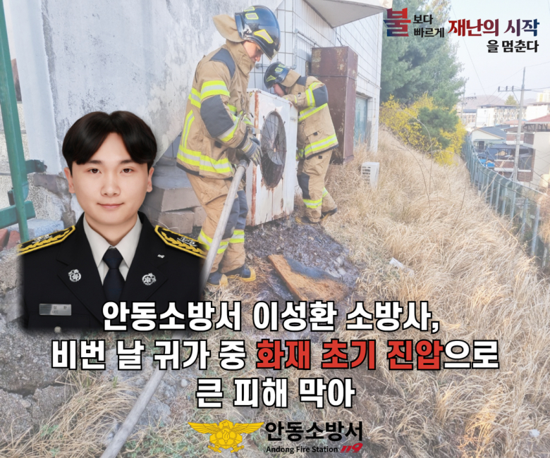안동소방서 소속 소방관이 비번날 귀가 중 발견한 화재 현장에서 망설임 없는 초동 조치로 시민의 소중한 재산을 지켜냈다.