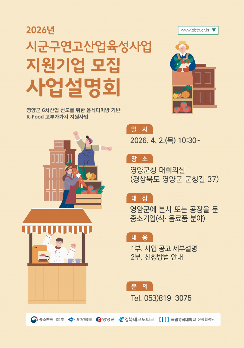 (재)경북테크노파크는 “2026년 시군구연고산업육성 협업프로젝트”의 일환으로 6차산업 선도를 위한 영양군 소재 식·음료품 분야 중소기업을 내달 15일까지 모집한다고 밝혔다.