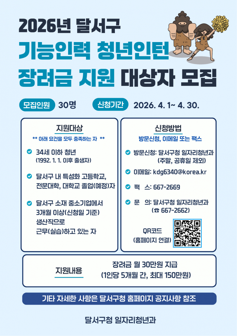 대구 달서구는 지역 청년의 취업을 촉진하고 지역 중소기업의 인력난 해소를 위해‘2026년 기능인력 청년인턴 장려금 지원사업’ 참여자를 모집한다.