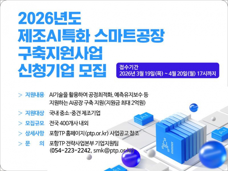 (재)포항테크노파크(원장 송경창, 이하 포항TP)는 포항지역 중소·중견 제조기업의 인공지능(AI) 기반 공정 개선과 데이터 중심 제조혁신을 이끌기 위해 ‘스마트공장 지원사업’ 참여기업을 모집한다.