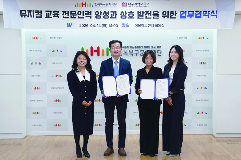 (재)행복북구문화재단 문화사업본부와 대구과학대학교 뮤지컬연기과는 14일 어울아트센터에서 뮤지컬 교육 전문인력 양성과 상호 발전을 위한 업무협약을 체결했다.