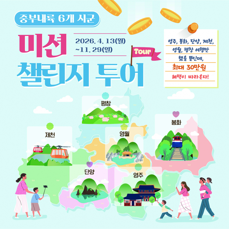 이번 사업은 경북도·충북도·강원도 접경 지역 6개 지자체가 공동 추진하는 관광 마케팅 프로그램으로, 여행객이 각 지역 명소를 방문하고 미션을 수행하면 지역 특산물을 경품으로 제공하는 참여형 이벤트다.
