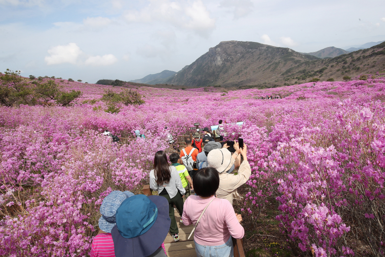 19일 대구 달성군 비슬산 대견사 인근 참꽃군락지에 곱게 핀 참꽃이 절정을 이룬 가운데 휴일을 맞은 시민들의 발길이 줄을 잇고 있다. 달성문화재단은 달성군을 대표하는 봄 축제인 '제30회 비슬산 참꽃문화제'를 17~19일 국립대구과학관 광장과 비슬산 일원에서 개최했다. 뉴스1