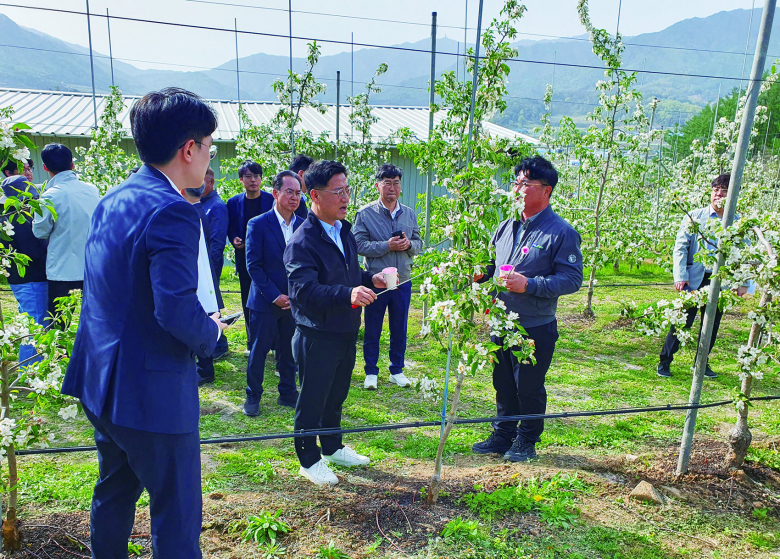 이번 방문은 이상기후로 사과 생산 불안정성이 커지는 상황에서 직접 과수재배 현장을 방문하여 개화기 생육상황을 현지점검하고, 안정적 생산을 위한 기술 적용 방안을 논의하기 위해 마련됐다.