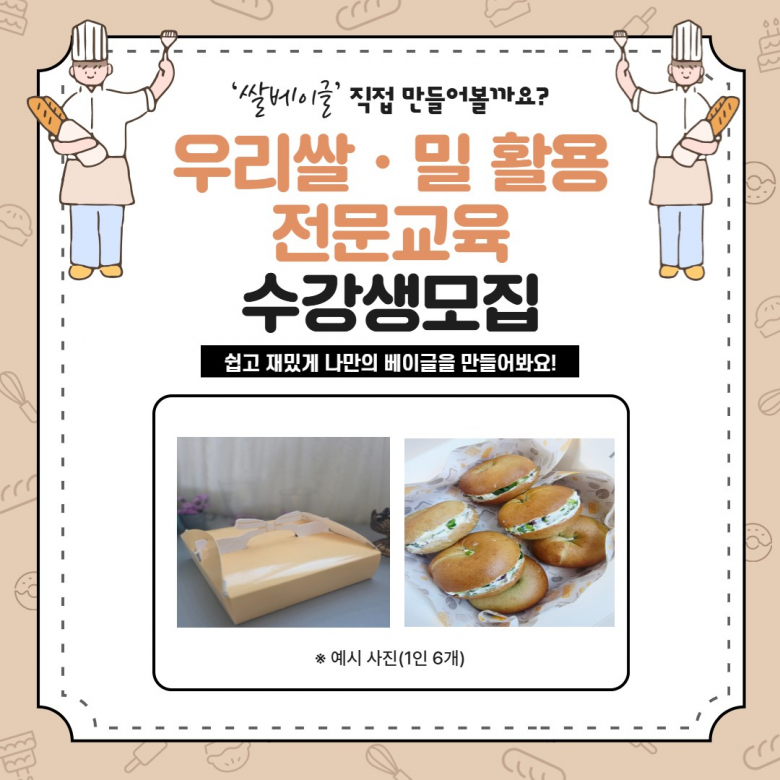이번 교육은 우리 쌀을 활용한 ‘쌀 베이글과 쪽파 크림치즈 만들기’ 실습으로, 지역부모와 자녀를 대상으로 운영된다.