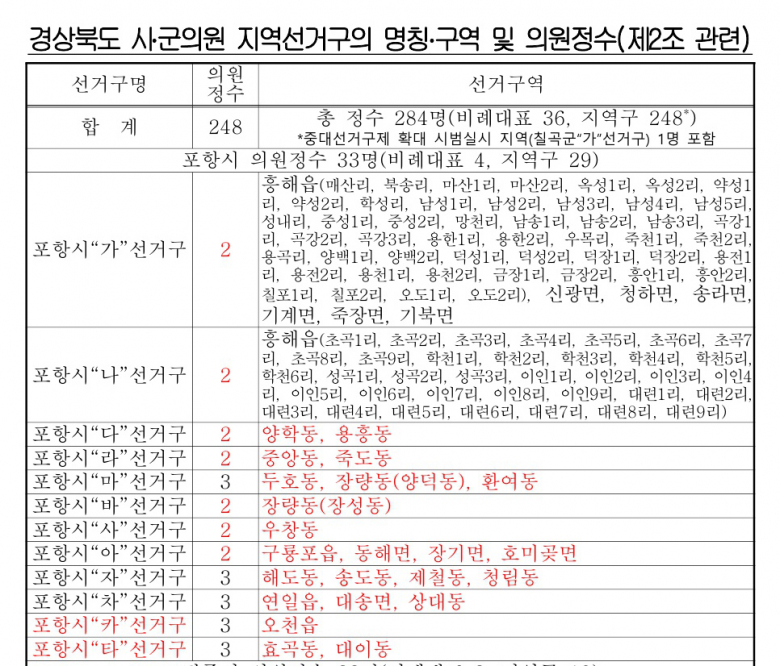 반면 「해도동·송도동·제철동·청림동」이 포함된 ‘자 선거구’, 「연일읍·대송면·상대동」의 ‘차 선거구’, 「오천읍」 ‘카 선거구’, 「효곡동·대이동」 ‘타 선거구’ 등은 3인 선거구를 유지하게 됐다.
