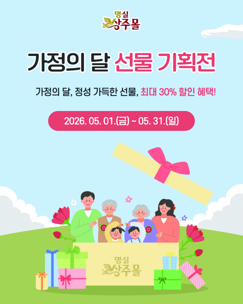 상주시가 운영하는 농특산물 온라인 쇼핑몰 ‘명실상주몰’(https://sjmall.cyso.co.kr)에서 5월 가정의 달을 맞아 내달 1일부터 31일까지 특별 할인행사를 진행한다.